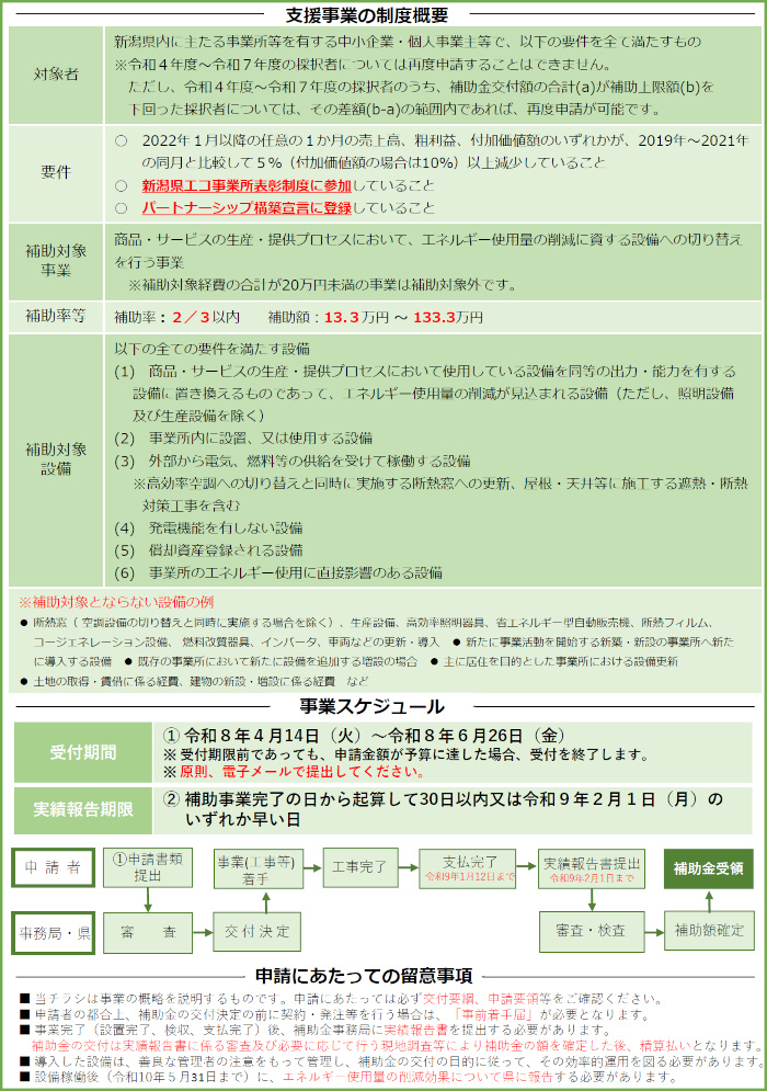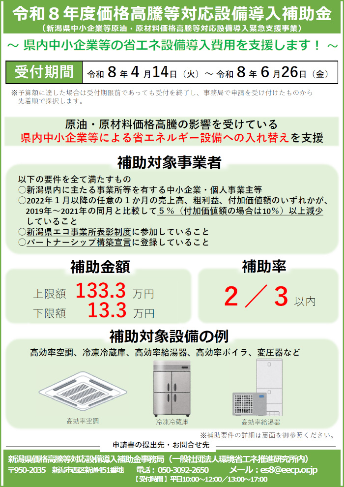 新潟県では、原油・原材料価格の高騰等の影響を受けている県内中小企業が行う、商品・サービス提供の生産・提供プロセスにおける省エネルギー設備の導入を支援するため「令和8年度価格高騰等対応設備導入補助金」の申請受付を開始しましたのでお知らせします。詳細は県HPをご覧下さい。